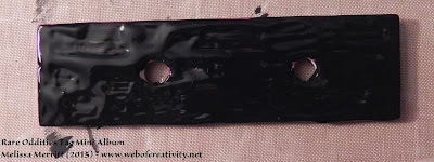 Attach the label piece using Tim Holtz small hinge to the largest mat before attaching the mat to the tag.  Also attach a small chipboard piece with a brad to the mat before it is attached to the tag.