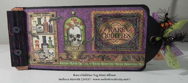 I love Halloween.  So I jumped on a Halloween project early and it was easy with Graphic 45 Rare Oddities papers.  So I made an easy album, no written tutorial.  All measurements and details are on here in this post.  I just decorated large Graphic 45 tags and put them together using Tim Holtz Ruler Binding, which I painted. I have all the pages mirrored imaged from each other and each set of pages are different from the other.  Tag albums are really fun to play whether you put tags on a ring or attach them together.  Happy Halloween!