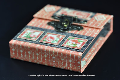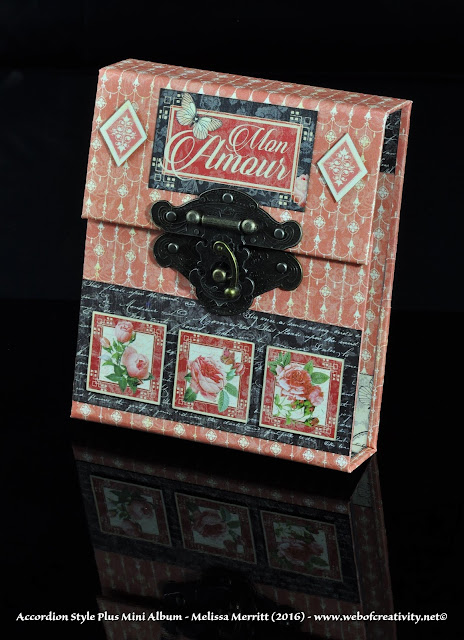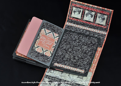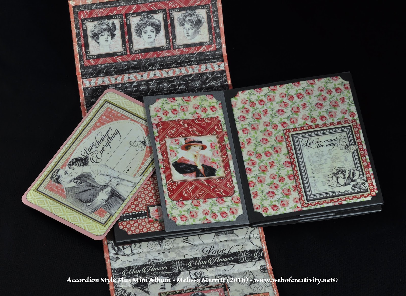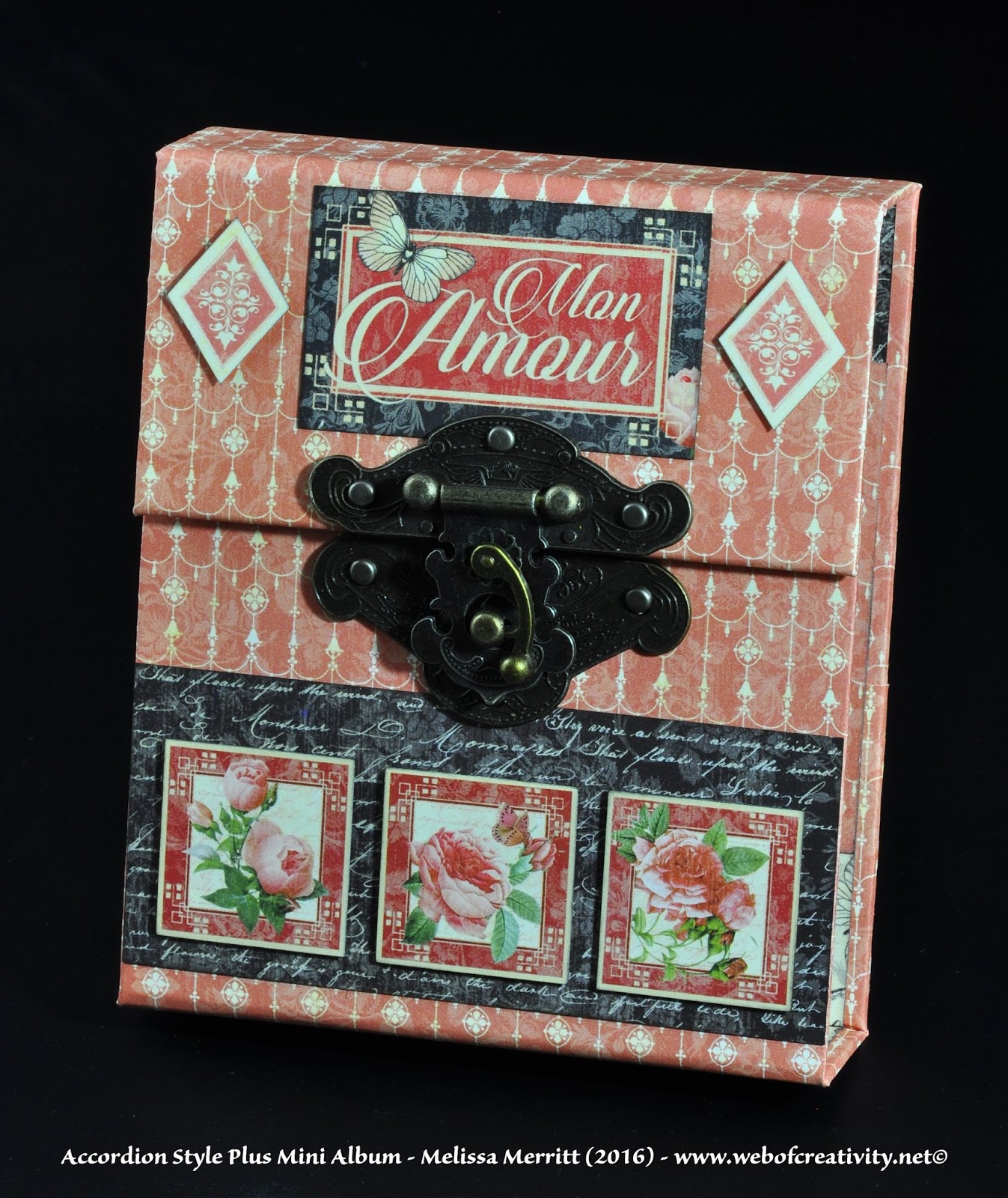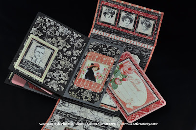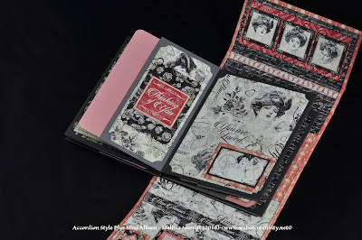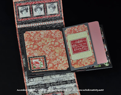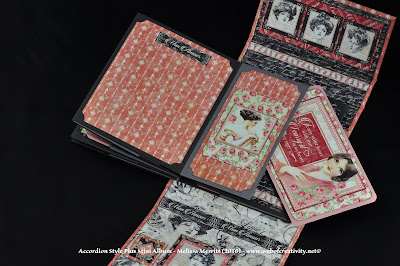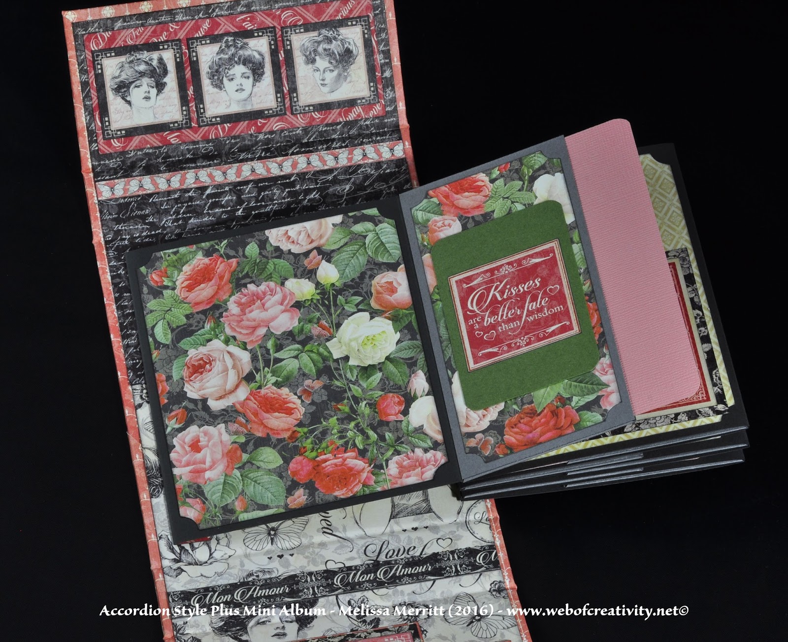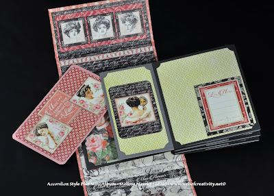 While patiently waiting for all the new products to trickle into the stores from CHA I have re-did my Accordion Style Plus Mini Album from Christmas and used Graphic 45 Mon Amour papers. I used the 8 x 8 pad for this one. I love how it turned out and it actually works great for a Valentine’s Day project. That is not the reason I made it, just a happy coincidence. The cardstock colors are black for the pages, gray for the pockets and pink for the tags.