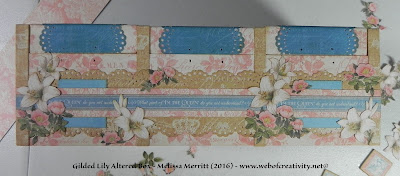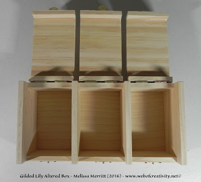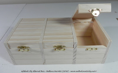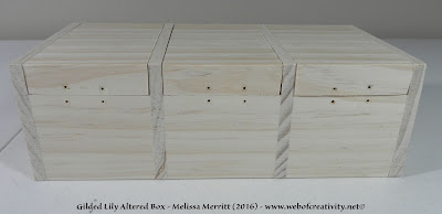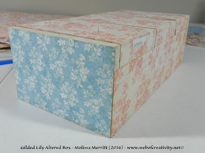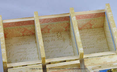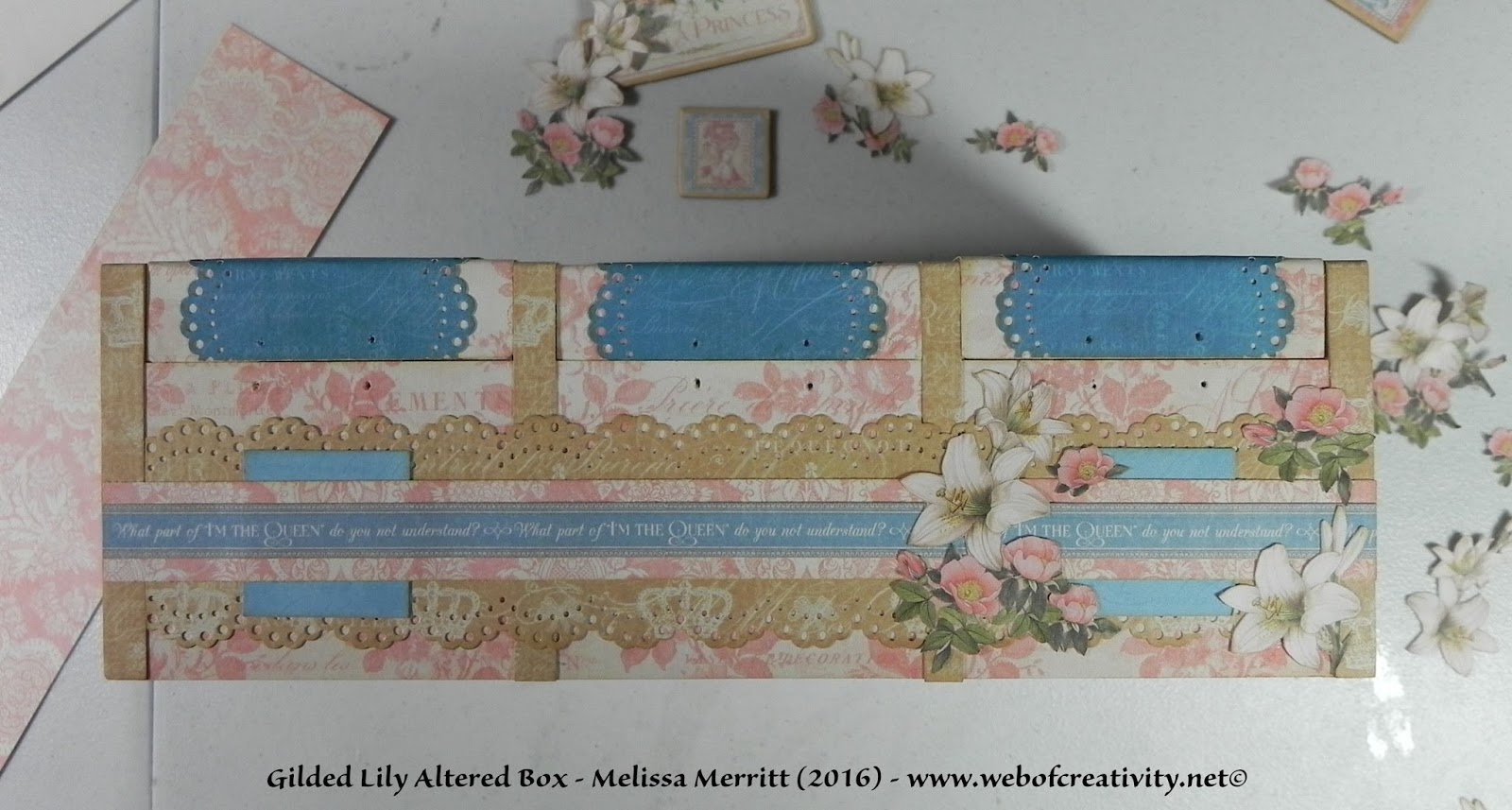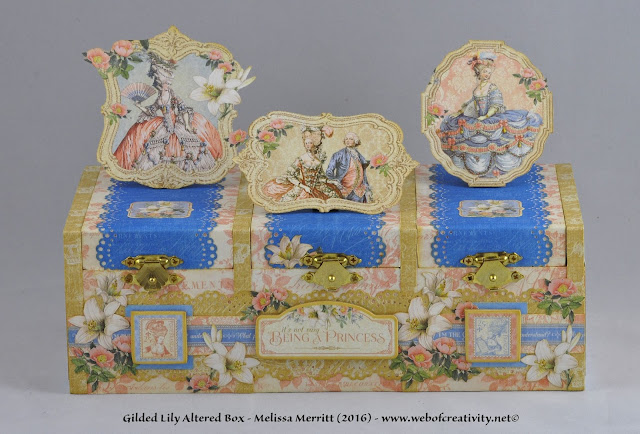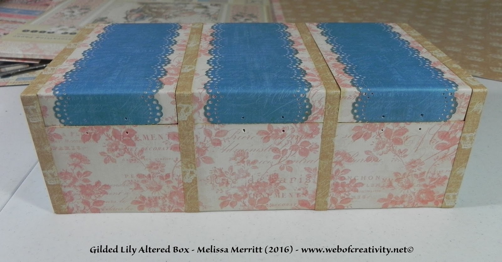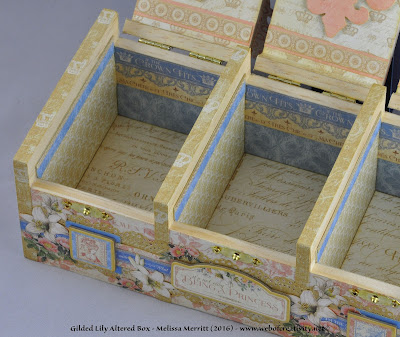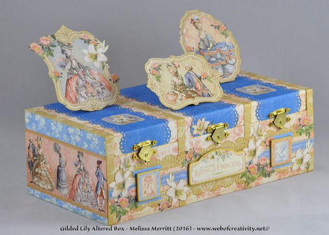 I found this cool box at AC Moore and decided to decorate it using Graphic 45 Gilded Lily paper collection. This box is 9 1/2″ x 3″ x 4 3/4″ and has 3 lids. Gilded Lily paper is a great paper to fussy cut with all the flowers and framed people in the papers. I just love this collection.