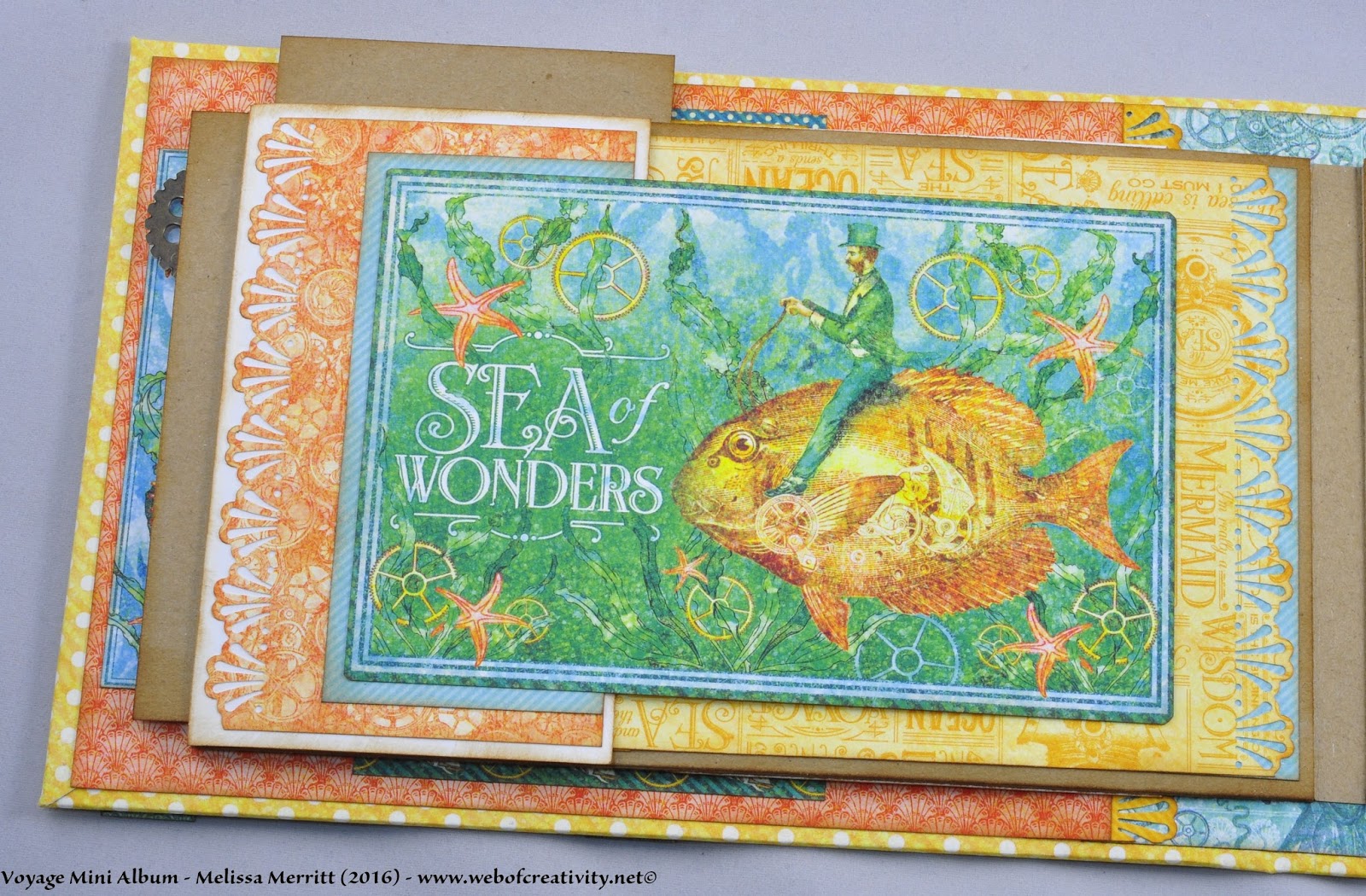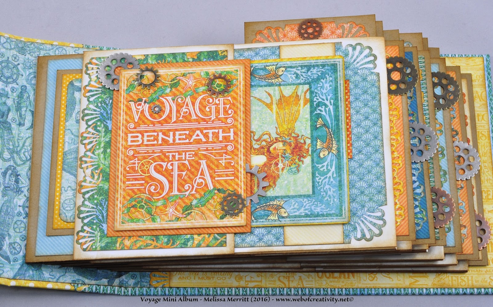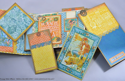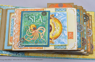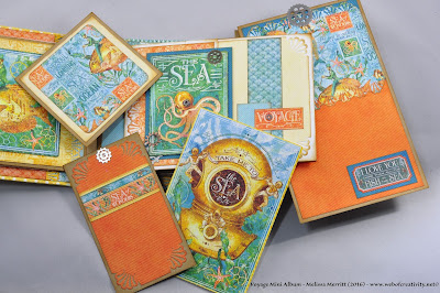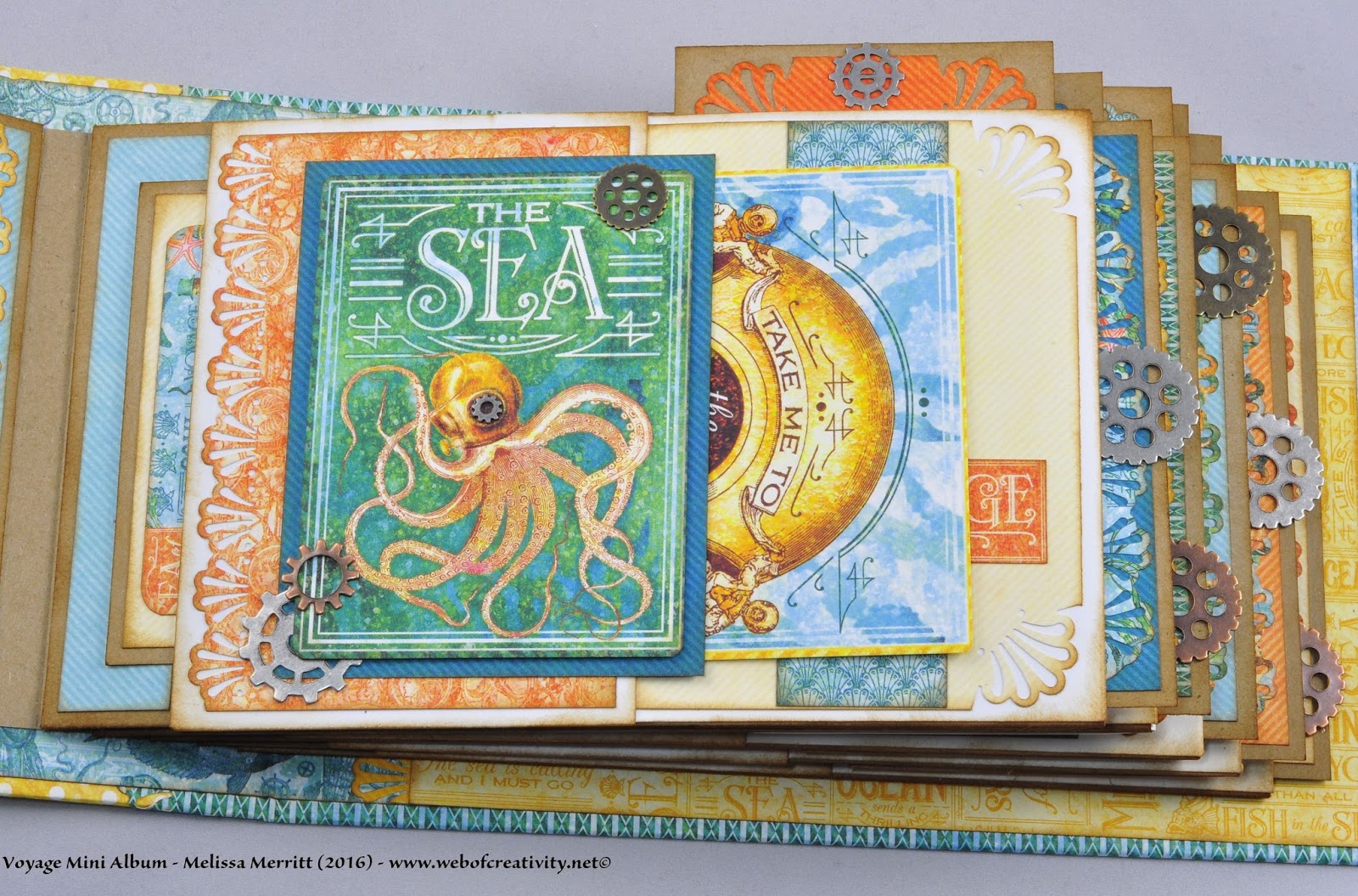 The project is Voyage Mini Album using Graphic 45 Voyage Beneath the Sea paper collection. I love this paper collection because it has a steampunk flair to it. The Kits are available now, and the tutorial will be available in a few days. I have a preview video done, it is at the end of this post. I am finishing up the page construction video and that will be posted when the tutorial is posted.