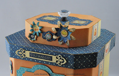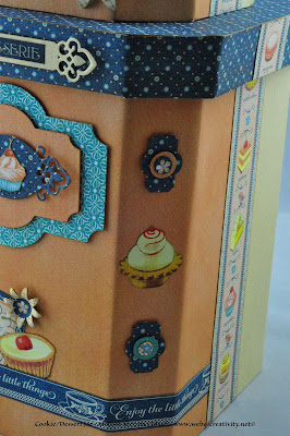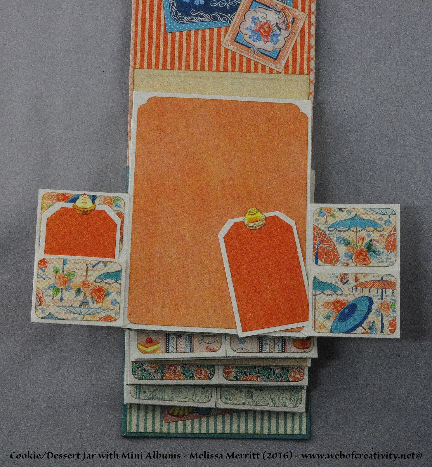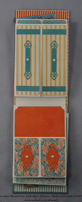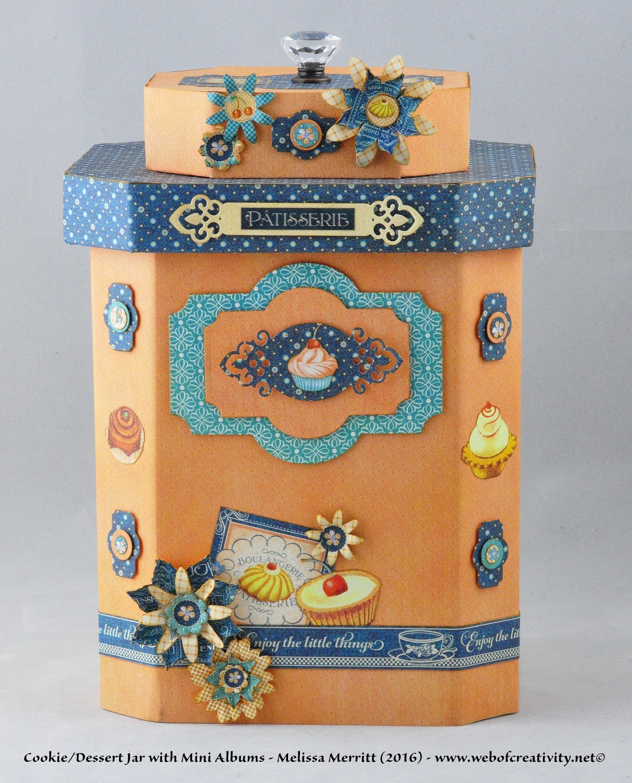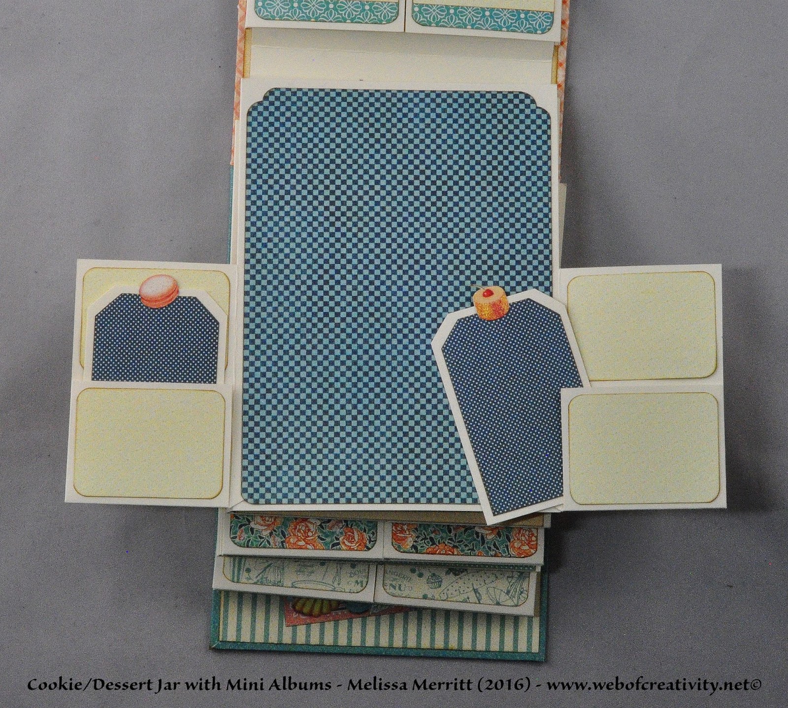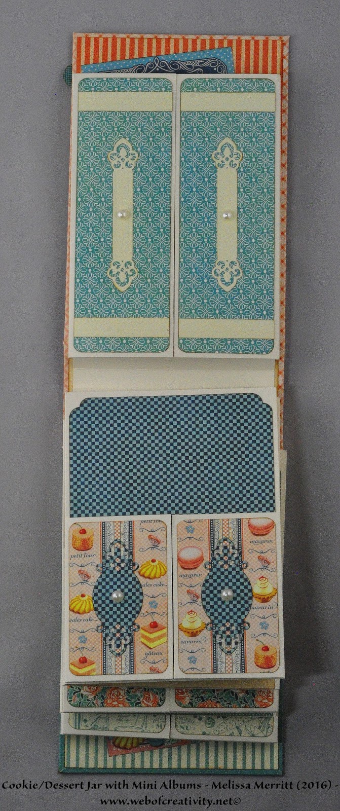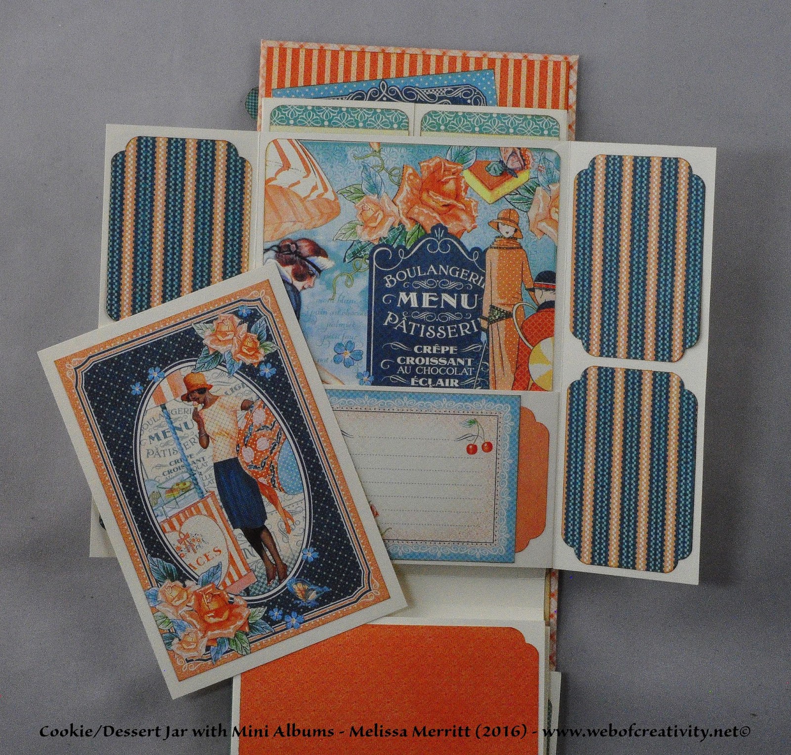 Inspired by Graphic 45 Cafe Parisian papers, I designed this Cookie/Dessert Jar that holds two mini albums inside. This jar is about 7 1/2″ wide and 10 1/2″ tall. The mini albums are both 5 1/2″ by 8″. The mini albums have 4 pages each. Inside each page has 4 flaps which can be used for photos or recipes. I used both the 12 x 12″ pattern paper and the 12 x 12″ solids for this project.