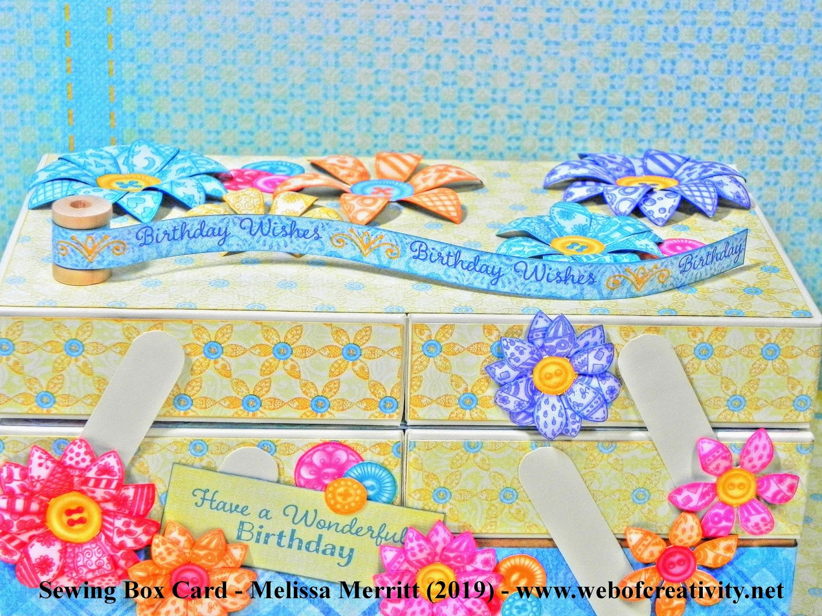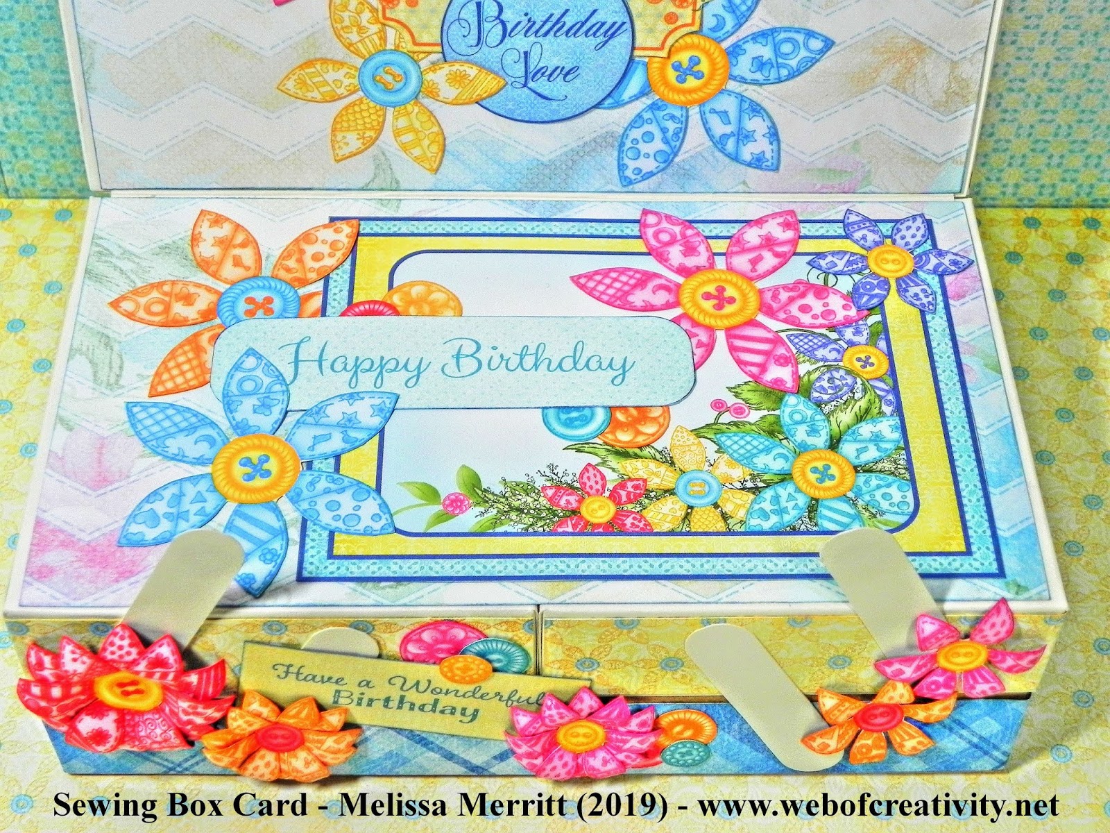 This (3D) Sewing Box Card is 7 x 4 x 3″ in size and I used Button and Blooms paper collection from Heartfelt Creations.